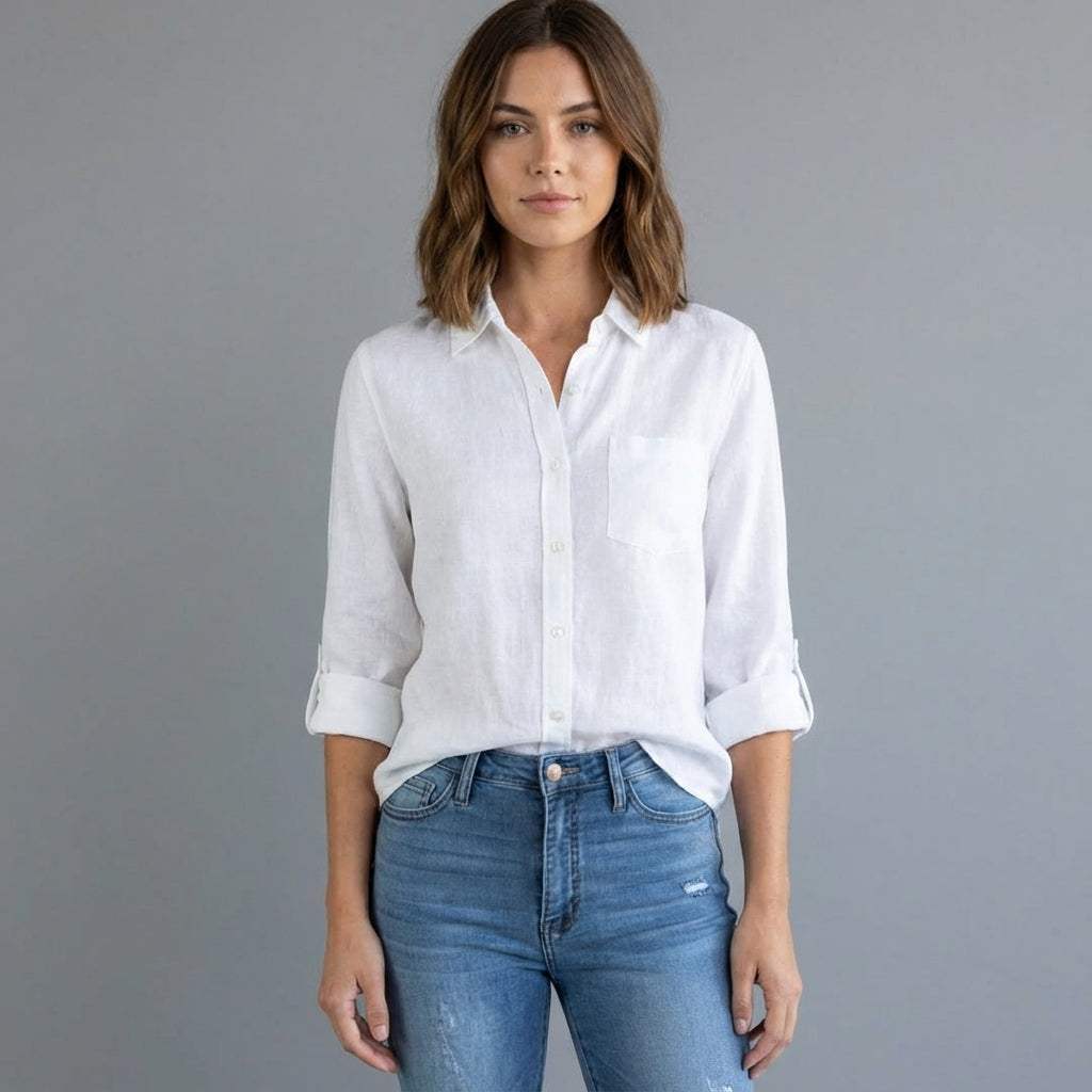 The breathable fabric makes it suitable for multiple seasons, while the clean silhouette pairs easily with jeans, trousers, or skirts. Sleeves can be worn down or rolled for a more casual look.